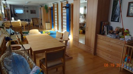 Die Räumlichkeiten der Tagespflege befinden sich im Tiefparterre. Der Aktionsraum hat eine Größe von 8x4 Meter, hat drei Oberlichter von Süden und Westen, ist durchgehend in hellen Farben tapeziert und mit Parkett ausgekleidet. In diesem Raum wird besonders in den witterungsungünstigen Zeiten der Hauptaufenthaltsort Ihres Kindes sein. Durch mehrere Installationen ist es möglich ein Pendelreck (in der Höhe der Kinder), ein Seil zum Klettern und schiefe Ebenen zu befestigen oder Podeste in unterschiedlichen Höhen aufzustellen. Darüber hinaus haben wir eine Sprossenwand und an der Nordseite einen vollflächigen Spiegel an der Wand befestigt. Hier können die Kinder sich selbst und andere beobachten.